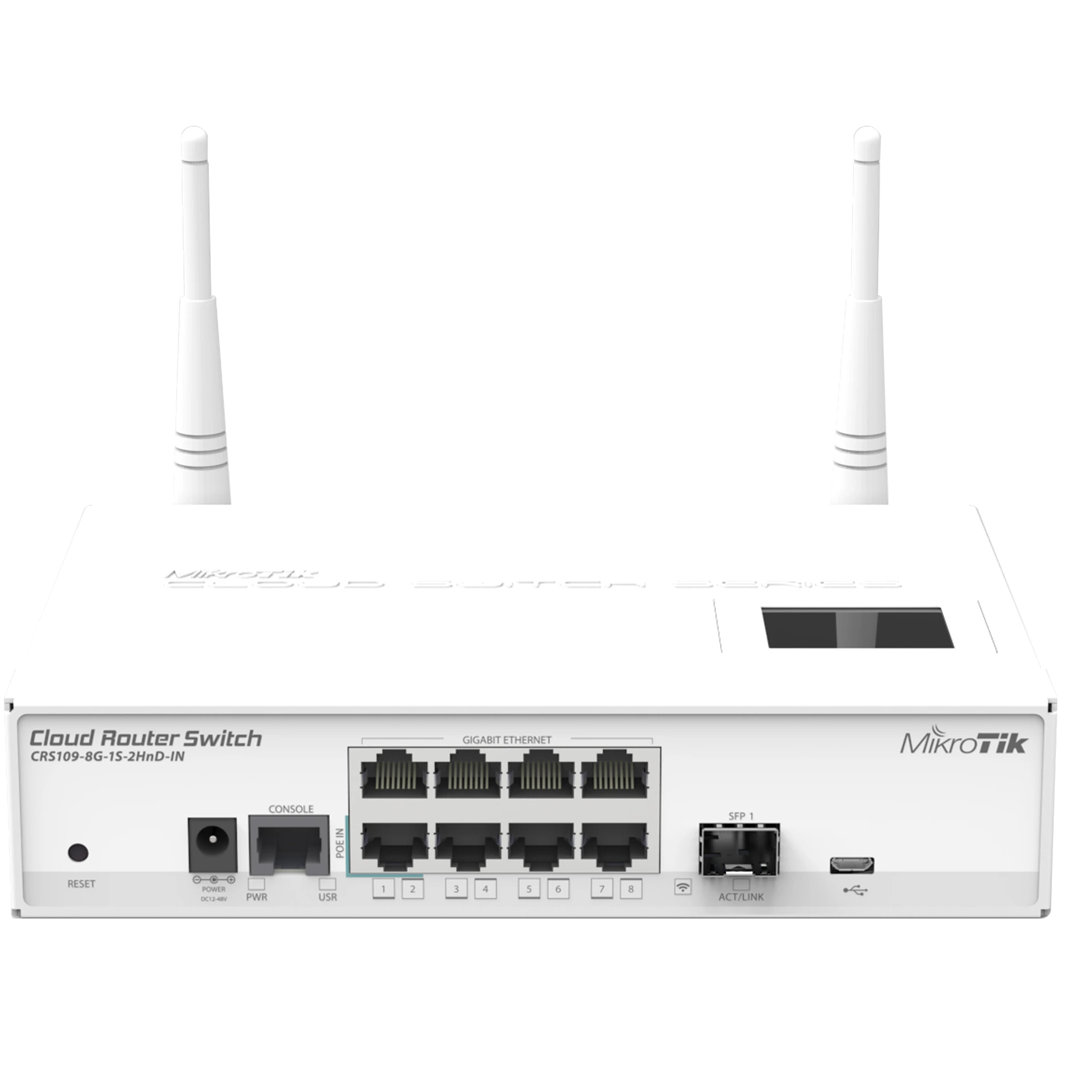 Cloud Router Switch 109-8G-1S-2HnD-IN is new “small size low cost” member of our CRS series. It comes with eight Gigabit Ethernet ports and high power 2.4GHz wireless. Product supports 10-57V and is 802.3af/at compliant!